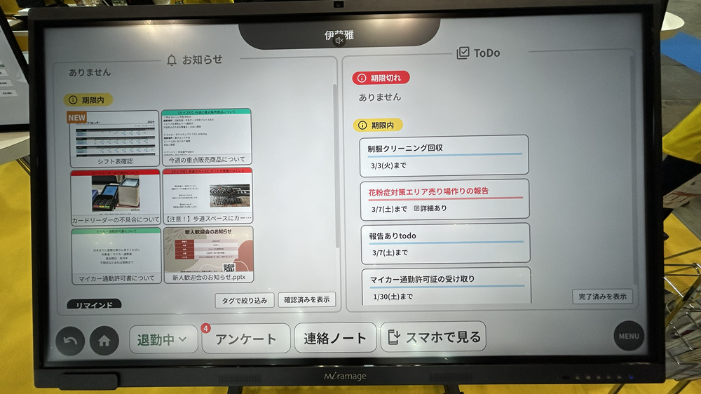 店舗や工場スタッフ向けの業務連絡や運営情報を一元管理・即時配信できる機能をデモでご覧いただきました。紙掲示や口頭伝達に依存したアナログ運用の解消、人手不足や多店舗展開といった小売業界の課題に対し、現場負荷を抑えつつ、店舗運営にご活用いただけます。
