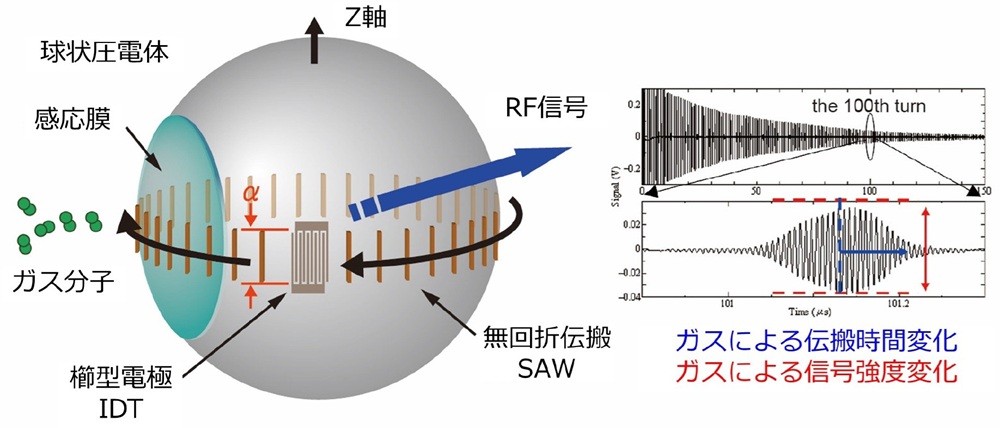球状圧電体の表面に設置した櫛型電極(IDT)に高周波信号を印加することで、弾性表面波(SAW)が励振されます。通常、波は伝搬するにつれ回折現象で発散してエネルギーを失ってしまいますが、球の表面では幾何学的に波を収束させる作用もあります。発散と集束のバランスを保つように理論的に設計されたIDTから励振されたSAWは、球の表面を無回折で多重周回します。SAWの伝搬経路上に成膜した感応膜にガス分子が吸着すると、SAWの伝搬時間や信号強度が変化し、その変化は周回数とともに拡大するため高感度にガスを検出できます。ボールSAWセンサは直径3.3 mmの水晶球を用いているため小型であり、室温で動作するため省電力です。